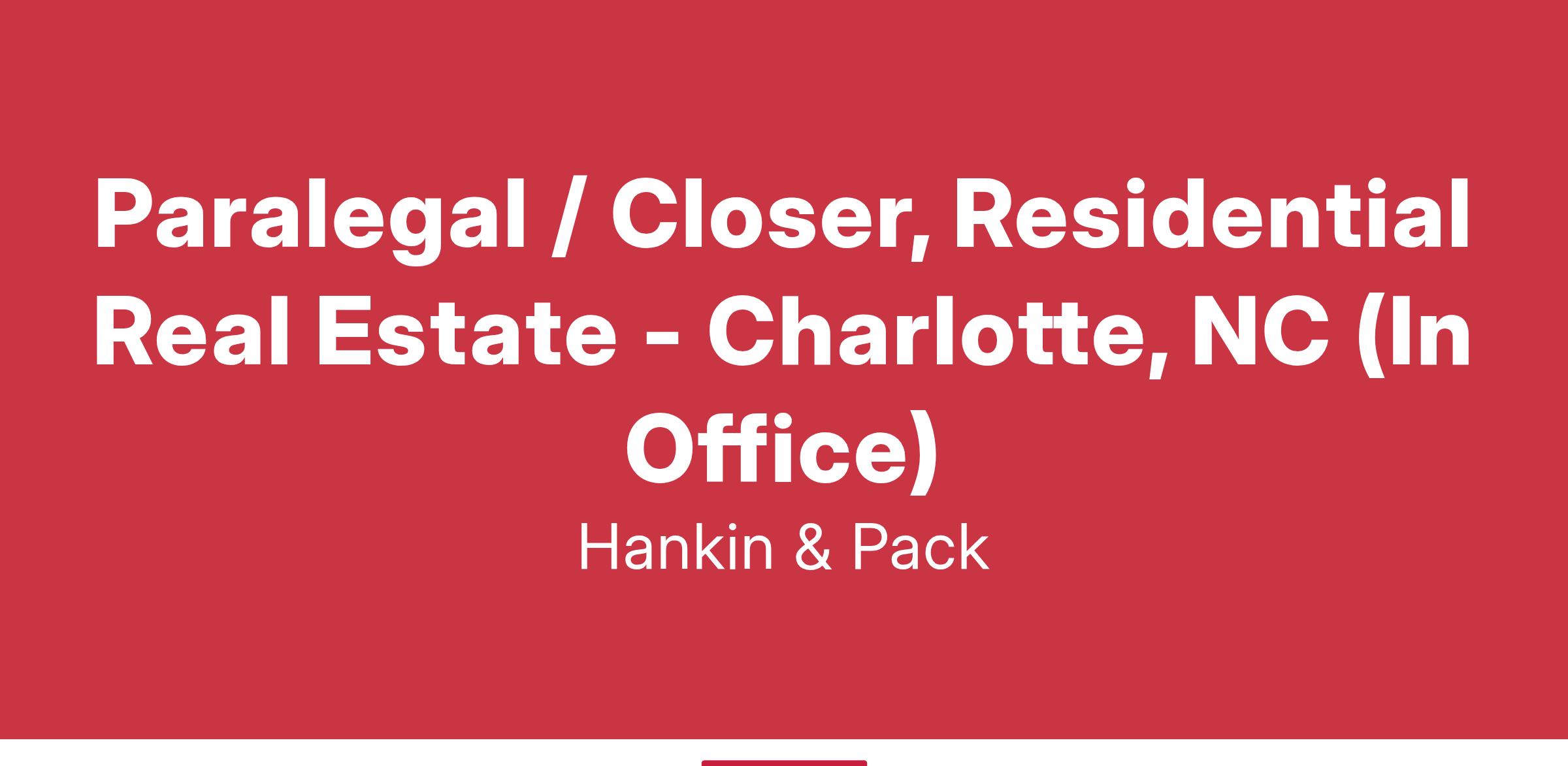 We are currently seeing an experienced Paralegal / Closer, Residential Real Estate for our Charlotte, NC office. This position will be in-office. The ideal candidate will understand the entire closing process and is able to switch between all closing processes as needed. The closer makes sure that all files are ready to go, all parties involved are informed, and that all closings go off without a hitch at the closing table.