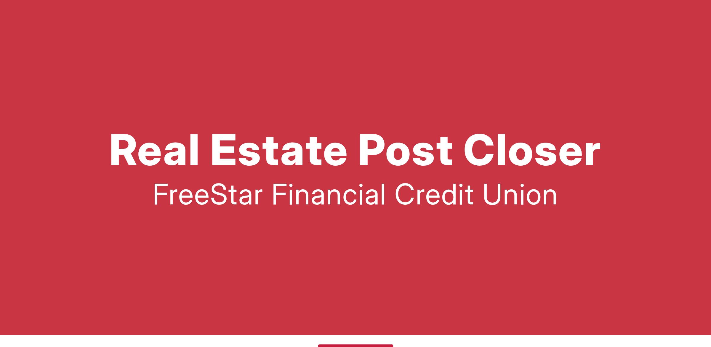 The primary purpose of the Post Closing Specialist is to assist FreeStar Financial Credit Union in fulfilling our mission positively by providing support to our Real Estate Lending department, and to provide superior service to our membership