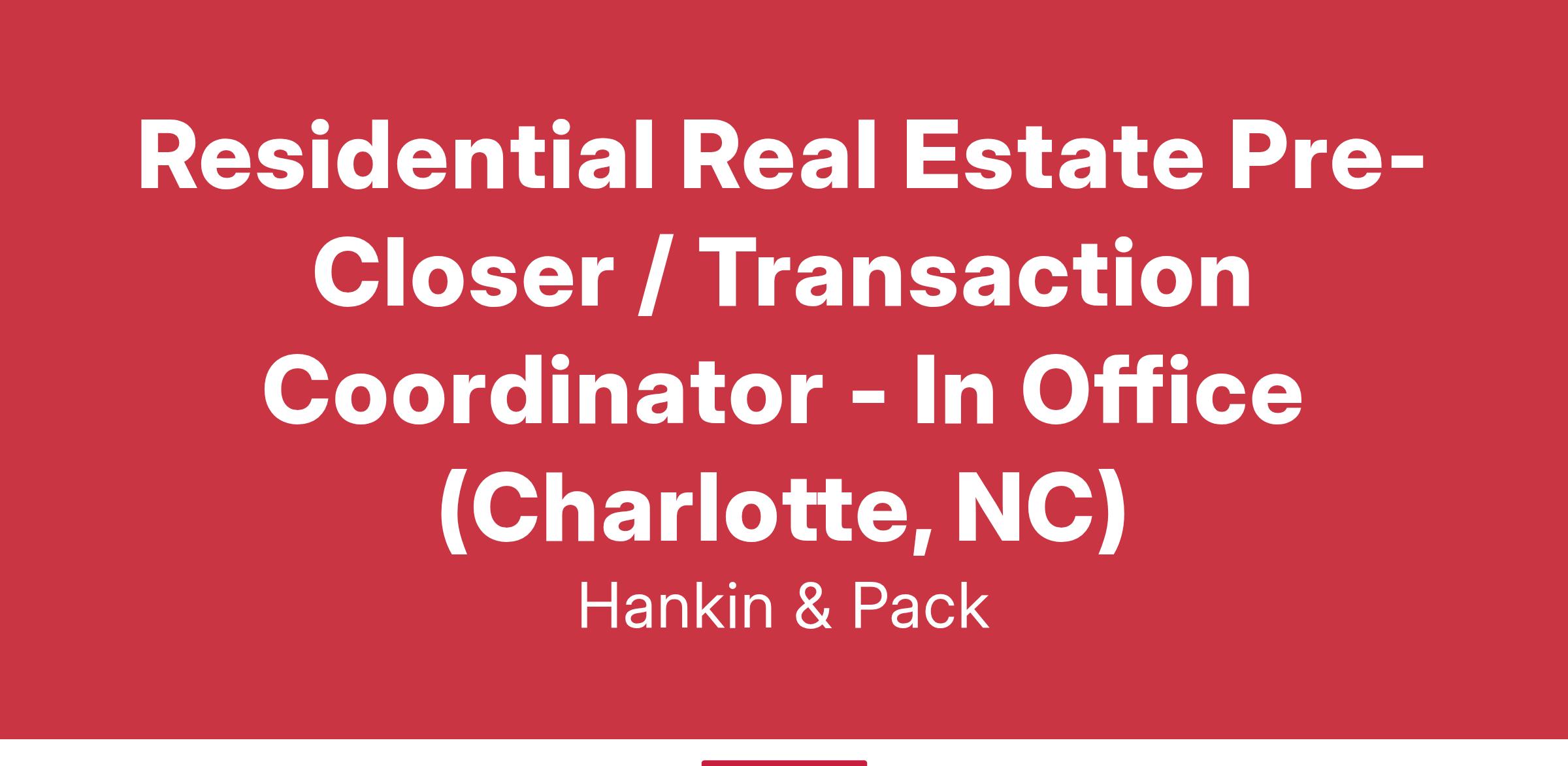 We are currently searching for a Real Estate Transaction Coordinator / Pre-Closer in our Charlotte, NC office to join our growing team! You will assist in handling real estate activities and transactions on behalf of clients.